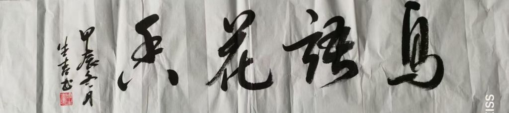 首先,从作品的字形来看,周生吉老师采用了行书的形式,笔画之间相互呼应,既不失行书的奔放,又充满了艺术的优雅。特别是在“鸟”和“香”这两个字上,字形处理极具个性,笔画有力而流畅,字形稳中带动,显示出作者深厚的书法功力。整体用笔奔放有力,笔画的起承转合自然流畅,似乎每一笔都在诉说着大自然的生动与灵动。