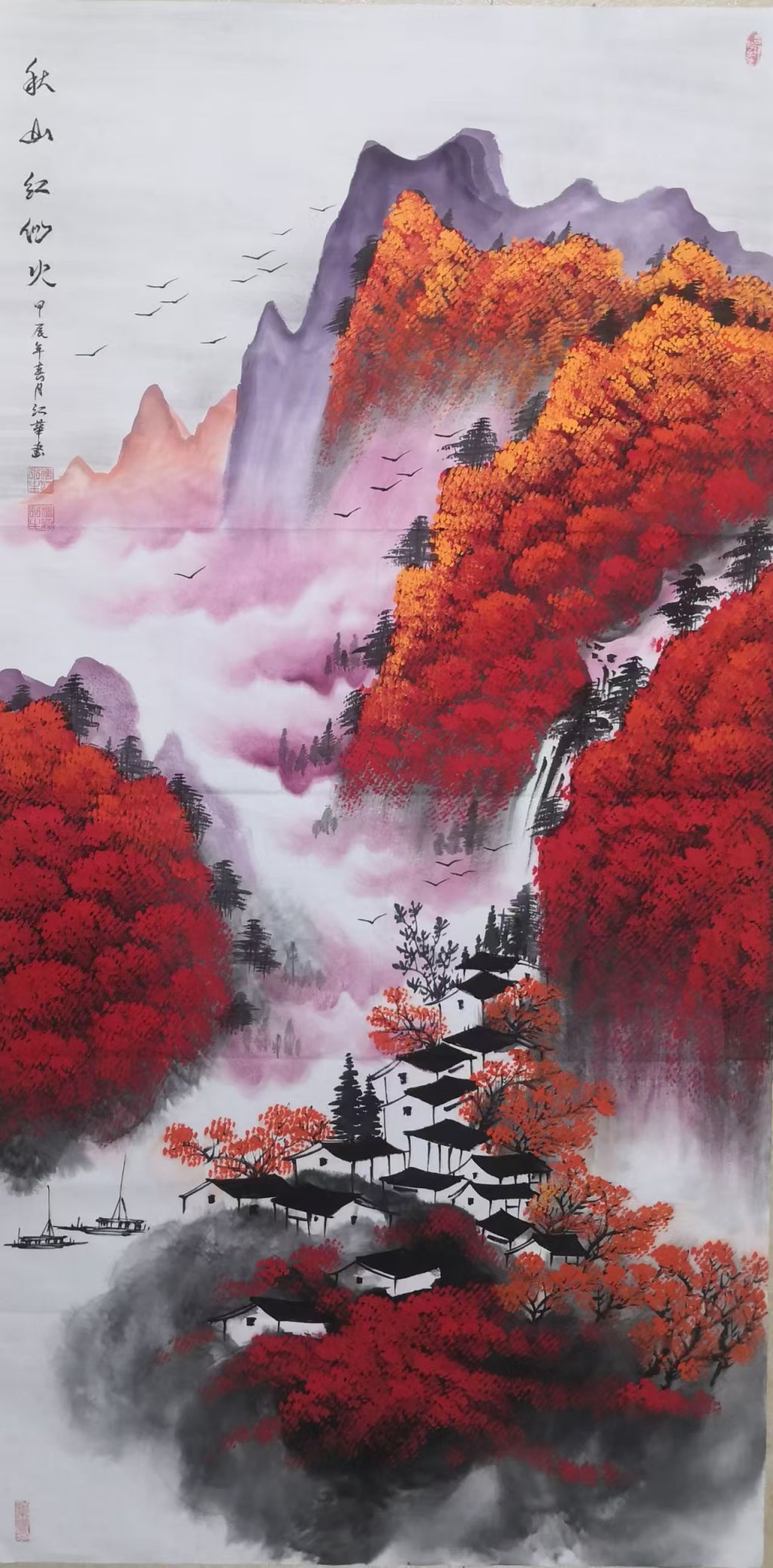 在意境表达上,这幅《秋山红似火》不仅展现了秋天大自然的壮丽景色,更传达了一种热烈奔放、富有生机的情感。漫山红遍,层林尽染,云雾缭绕间,村落静谧而悠然,让人不禁联想到“停车坐爱枫林晚,霜叶红于二月花”的诗意画面。画家通过笔墨、色彩和构图的精妙结合,不仅描绘了自然之美,也赋予了画面深厚的文化韵味和情感共鸣。