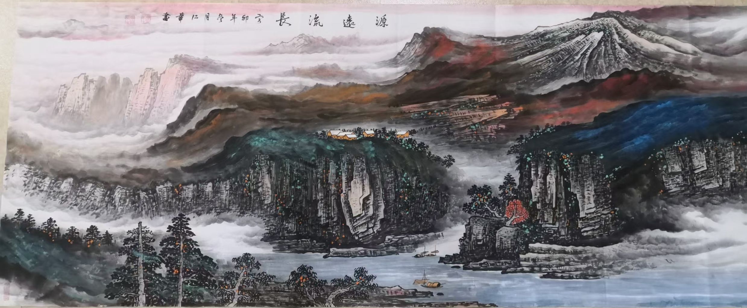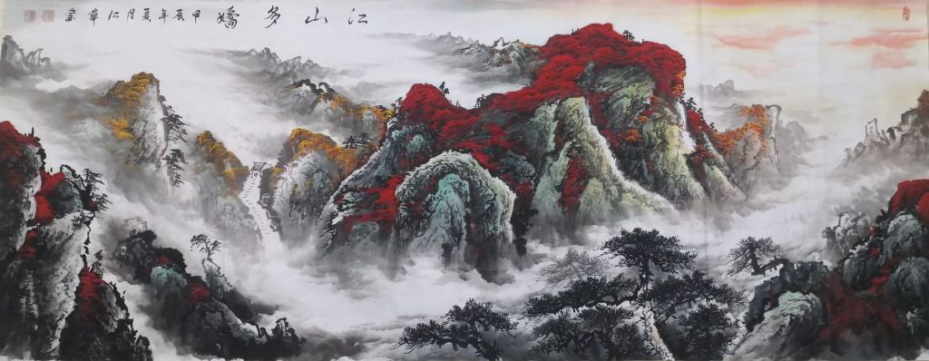 傅港水老师的这幅《秋山红似火》,以鲜明的色彩、细腻的笔触和巧妙的构图,生动地展现了秋日山水的壮丽景象。整幅作品气势恢宏,层次丰富,既有秋色绚烂的热烈之感,又有云雾缭绕的缥缈意境,营造出如诗如画的视觉体验,让人仿佛置身于一片绚烂的秋山之中,感受到大自然的瑰丽与生机。