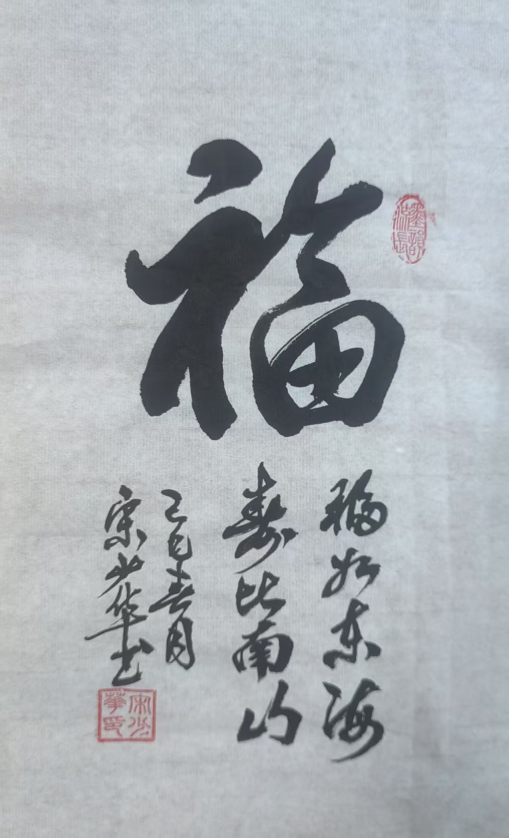 从用笔技巧上看,宋少华老师的笔法稳健而有力,笔画刚劲有力,浑厚中带有柔韧性,特别是在“天宝”与“福寿”这两个字的书写上,笔画的顿挫变化和起伏之间表现得非常自然,既突出了字形的雄浑感,又展示了字形的韵律感,令整幅作品充满了艺术的表现力和气势感。字与字之间的联系紧密而不拘束,起伏之间的流畅感让人感受到书法的自由与豪放。