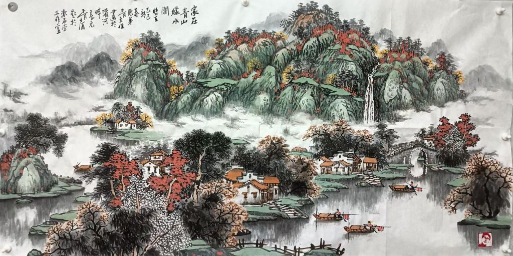 而最令人感动的,莫过于作品中体现出的生活情味。小桥流水、炊烟袅袅、人舟相伴,屋前洗衣、湖上渔歌,这些细节无不透露出对生活的热爱与眷恋,正如题目所言——“家在青山绿水间”,这是对“天人合一”理想境界的温柔诠释,也是一种质朴但深远的东方美学表达。