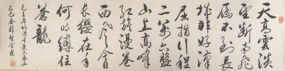 总体而言,这幅《清平乐·六盘山》展现了韩智全老师精湛的书法技艺和深厚的艺术功底。作品中的笔力雄浑,行云流水的笔触、自然流畅的布局,使得整幅作品既具气势又富有细腻的美感。通过这幅作品,我们仿佛感受到诗词所蕴含的豪情壮志和对未来的期望,体现了毛泽东的革命精神与历史厚重感。韩智全老师的这幅书法作品,是一次令人震撼的艺术呈现,展现了书法艺术的独特魅力与深刻内涵。
